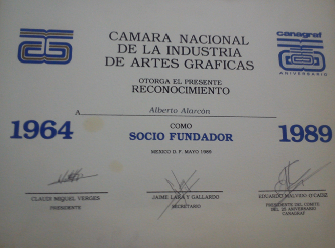 En el ramo de las Artes Gráficas, se cuenta con una experiencia de casi 50 años, ya que somos socios fundadores en la “CAMARA NACIONAL DE LA INDUSTRIA DE LAS ARTES GRAFICAS (CANAGRAF)” de la seccion de encuadernacion desde el año 1964. Gracias al Sr. Alberto Alarcón Vivas. Hemos ofrecido hasta hoy, por excelencia nuestros servicios en encuadernación. ![]() Sr. Alberto Alarcón Vivas